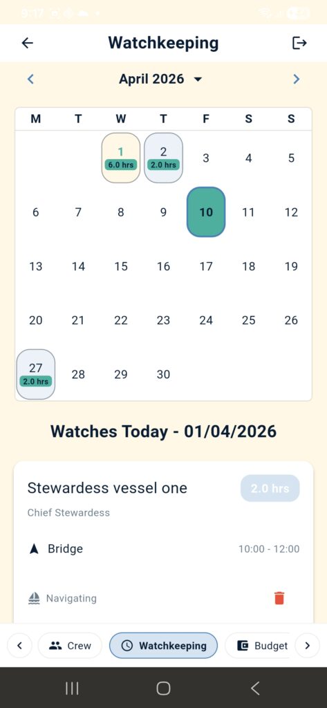 Plan and manage crew watchkeeping with a dedicated calendar designed for maritime operations.
